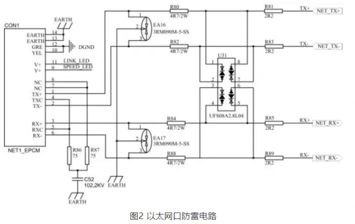 在如圖2所示的網口防雷電路中,在網絡變壓器和網口插座之間增加放電管和雙向瞬態電壓泄放電路組成的兩級防護電路,極大的增強了網口的差模防護能力。第一限流電阻R80、R82、R84、R88和氣體放電管EA16、EA17組成了一級防護電路,對雷擊的浪涌電壓進行第一級保護,具有泄放雷電暫態過電流和限流過電壓作用。一級防護電路可以產生很大的泄放電流(3KA),大部分入侵能量通過地泄放。