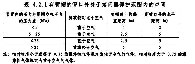 3排放爆炸危險氣體、蒸氣或粉塵的放散管、呼吸閥、排風管等,當其排放物達不到爆炸濃度、長期點火燃燒、一排放就點火燃燒,以及發生事故時排放物才達到爆炸濃度的通風管、安全閥,接閃器的保護范圍可僅保護到管帽,無管帽時可僅保護到管口